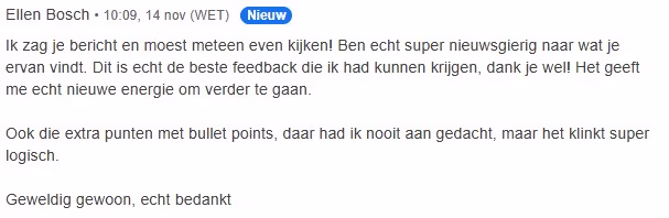 Het meeste waardevolle? Ik had écht het idee dat je 3 maanden lang persoonlijk meegedoken bent in mijn avontuur ipv andersom. Dus ook echt inleven in mijn dienst, doelgroep en schrijfstijl. Zo kon ik dicht bij mezelf blijven maar ook professionaliseren met jouw kennis en ervaring. Ik heb ook coaching gehad waarbij ik achteraf dach: poeh dat had ik zelf ook wel kunnen bedenken, zo generiek. Dat heb ik bij jou geen 1x gehad.