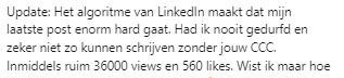 Bliep. Mailtje in mijn inbox: “De post over psychologische veiligheid heeft behoorlijk wat reuring veroorzaakt: bijna 6.000 views en bovendien is de blog op de site 175 keer bekeken”, aldus Marion. Bliep. 1,5 maand later: “De blog is inmiddels 345 keer gelezen en het aantal views van de post gestegen naar 10.300“. 3 weken later: “Update: Het algoritme van LinkedIn maakt dat mijn laatste post enorm hard gaat. Had ik nooit gedurfd en zeker niet zo kunnen schrijven zonder jouw CCC. Inmiddels ruim 36.000 views en 560 likes. Thanks!”